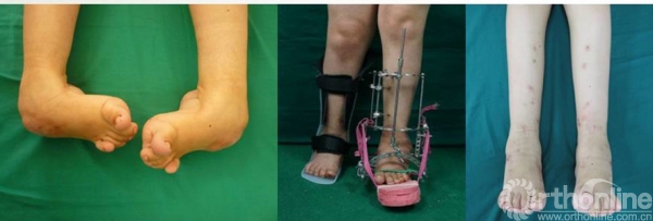 患者,女性,25岁,脊柱裂,脊柱裂后遗双侧马蹄内翻足畸形(重度),经Ilizarov矫形外固定手术,双足畸形矫正。