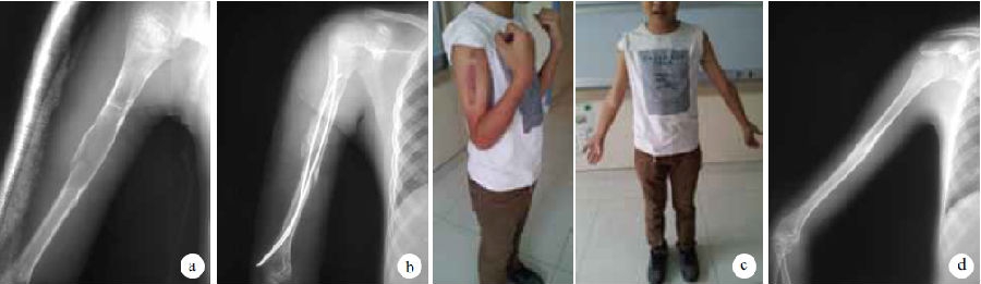 图1 患儿,男,14岁,右肱骨骨囊肿并病理性骨折 a术前X线片 b术后2dX线片 c术后1年功能位 d术后2年X线片