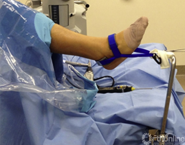 图2.仰卧位时使用的关节镜腿部固定器和非侵入性踝关节牵引器.