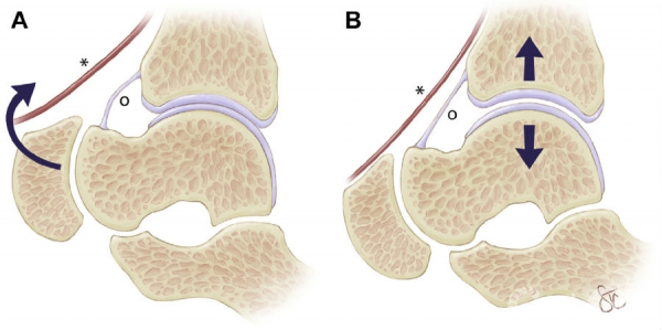 (A)在踝关节背屈时,前关节囊与前方的神经血管结构有更大的空间;