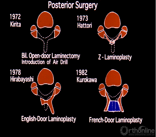 1982年,日本东京大学黑川高秀(Kurokawa)教授报道了棘突纵割式颈椎管扩大成形术(法式开门椎板成形术,French door-open laminoplasty ),此术式在日文文献中多命名为“脊柱管扩大术”,在我国学者多数建议统一命名为“双开门椎管扩大成形术”英文译为(double door laminoplasy)。此后,国内引进了颈椎后路椎管扩大成形术治疗不同原因引起的颈椎管狭窄症,并取得了较为满意的效果。