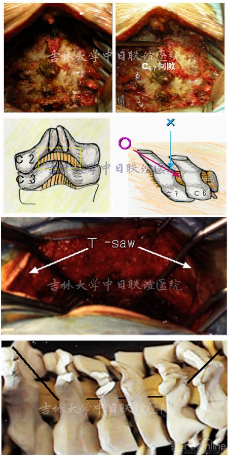 ②本术式仅在椎板及棘突中央锯开,线锯直径为0.5-0.6cm,保留了椎板和棘突间的骨质, 也保持了颈椎的后方解剖结构,而使用磨钻和摆锯操作时,易造成棘突及椎板的骨质磨损丢失,即“cutting lose”,造成医源性的“开门”,棘突和椎板骨折。
