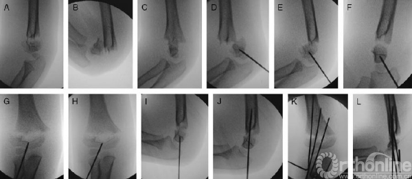 图2。一个5岁男孩的肱骨远端多向不稳定肱骨髁上骨折。A、多向不稳定骨折:伸直位时远折端分离及向后移动。B、在试图减小骨折移位后,远端骨折端已经先移动了。在病人术前准备及铺单之前就已经完成,因为该手术要求将病人手臂保持固定,C臂机环绕在肘关节周围。C.在轴向平面(旋转)中,这2个片段严重的移位。D、应用纵向牵引和操纵杆(2毫米)横向穿过未复位的肱骨小头。E.因为远端的片段是完全松动的,所以尝试用曲肘来取代之前的位置关系。F、轻轻转动肱骨近段直到获得一个完美的骨折远端侧面图像,操纵杆是用于在轴向平面旋转远端片段直到它在轴向平面(旋转)与近端片段对齐。注意,在矢状面骨折还未复位。G、C臂机在前后位(AP)旋转以发现骨折远端的横向位移。H.在冠状面上,可以通过轻轻的平移远端片段减小骨折移位。I.C臂机再次旋转到侧面。用操纵杆来纠正矢状面移位和远折端的成角畸形。J.在骨折复位后,操纵杆穿过骨折部位。K,另外两枚克氏针通过肱骨小头侧面穿入。L、C臂机拍摄正、侧位图像,最终确认骨折的解剖复位。