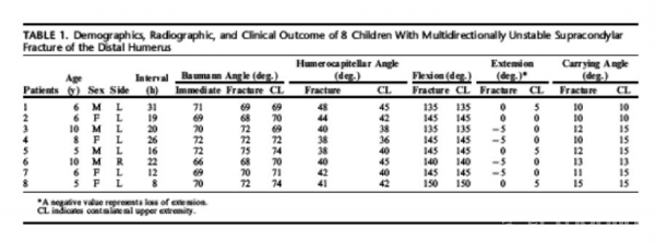 我们研究的局限性包括缺乏与其他形式复位和固定的直接比较。这种骨折类型很少会遇到,因此很难从一个单一的机构获得大量相同的病例。二,我们的样本量太小以至于我们不能明确得出远折端移位型肱骨髁上骨折对骨折稳定性有直接影响的结论。