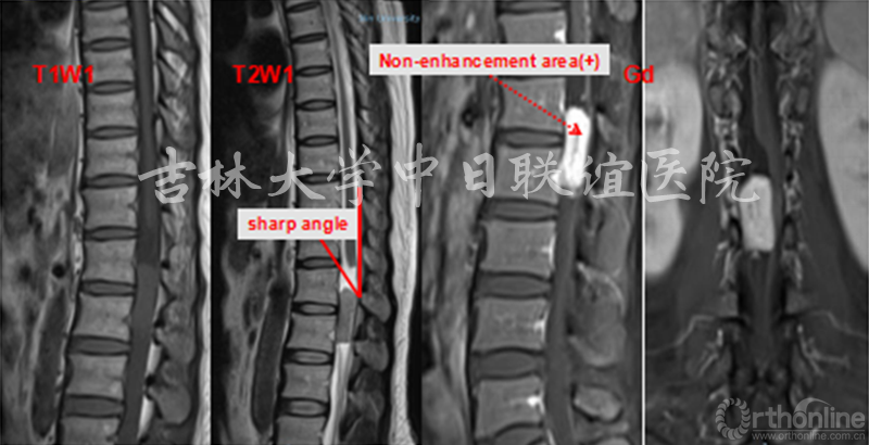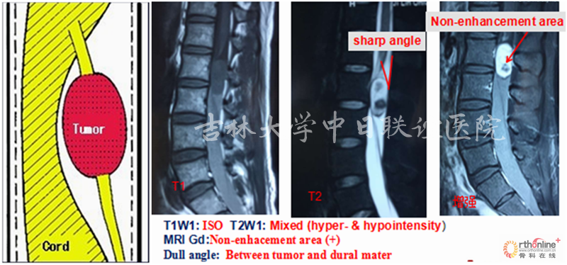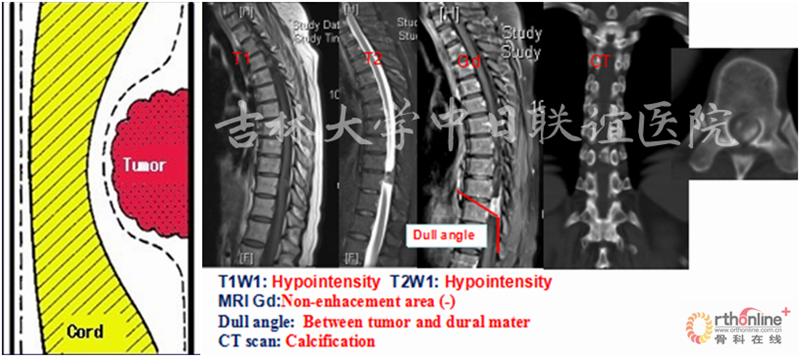 MRI:T1W1:相对脊髓呈等信号;T2W1:相对脊髓呈略高信号,瘤体与硬膜呈锐角,脑脊液在瘤体上缘增宽呈“杯口征”(瘤体位于硬膜下);MRI Gd:肿瘤边缘明显强化,瘤体中央伴有不均匀性增强。肿瘤与脊髓之间呈锐角,形成“肩胛征”,脊髓呈鸟嘴样改变(髓外)。