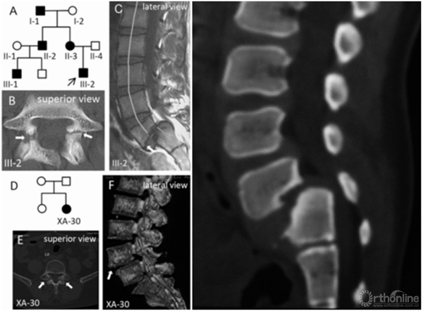对重度骶骨发育不良者,先天遗传是主要原因。2015年,罗卓荆团队通过两个家系[6],鉴定了2个新型错义突变,功能研究显示软骨发育过程中,磷酸化摄入障碍是其发病主要的分子机制。遗传因素造成的骶骨穹窿形态不良,通常较为严重,并会造成L5椎体梯形变,导致滑脱进展,并使得外科治疗此类畸形较为困难。