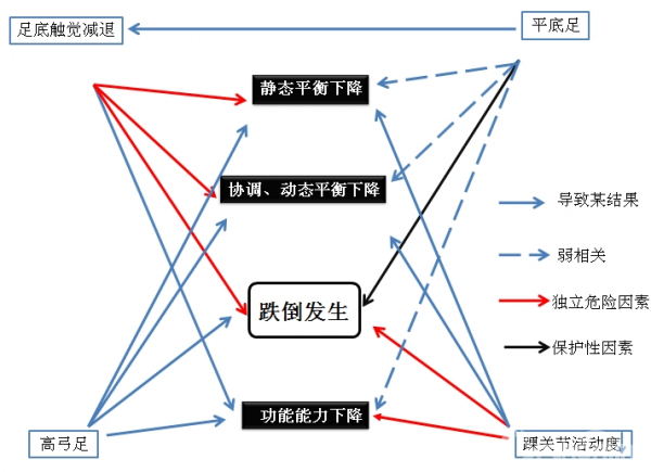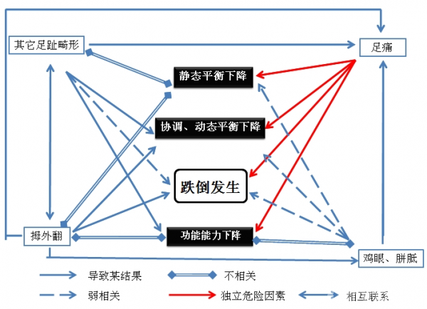 前瞻性及回顾性的大规模调查研究均支持老年足病是引起跌倒的独立危险因素之一。在近几年中,更多的研究倾向于研究具体足病和跌倒及平衡功能的关系,我们制作了关系图以便理解(图3,图4)。