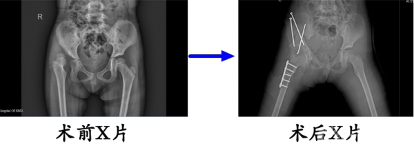 刘某某,双侧发育性髋关节发育不良,在我院行改良salter截骨后,复位良好。