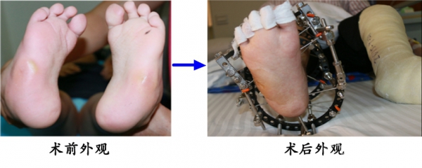 5.8岁大龄的僵硬的马蹄内翻足,单纯手法+石膏已不能完全矫正畸形,采用Ilizarov外架,结合截骨术,矫正畸形。