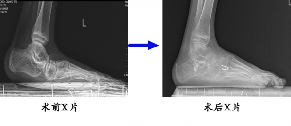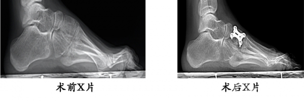7.14岁女性,腓骨肌萎缩症,高弓足畸形。行内侧楔骨截骨、肌腱转位术,矫正畸形,恢复正常足弓。