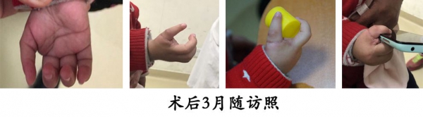 10.4岁,男孩,蟹钳指畸形(WasselIV型),行改良BC术式,术中行畸形纠正、肌力平衡、功能重建、整形修复,术后2个月随访,外观及功能恢复满意。