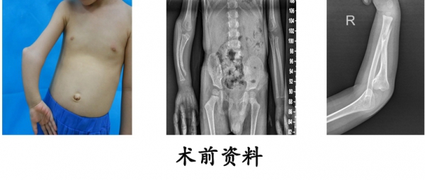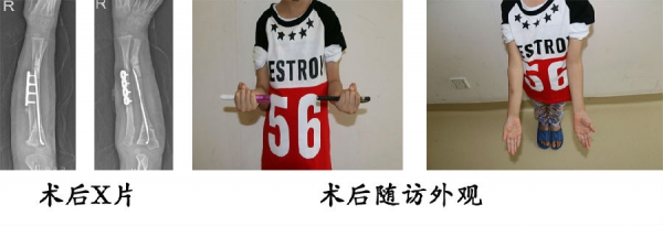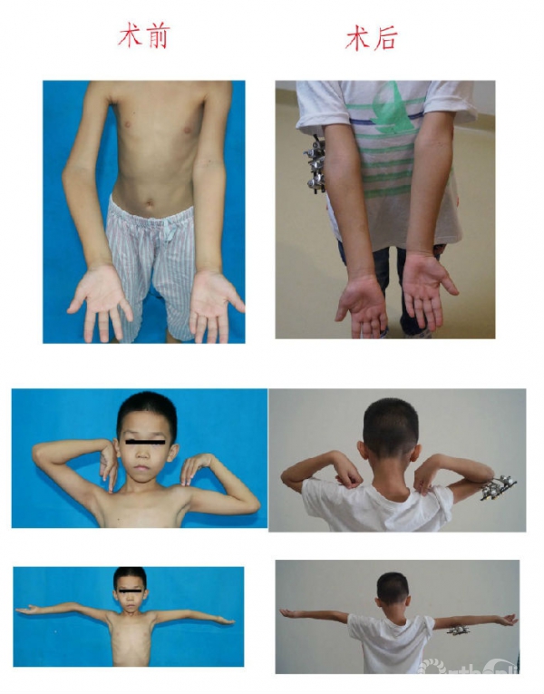 9.3岁,男,右侧尺骨干续连症;右侧尺骨远端骨软骨瘤。右侧尺骨远端骨软骨瘤切除、尺骨截骨随内针固定+单边外固定架延长。1年后随访,右侧前臂畸形纠正,前臂活动度明显改善。