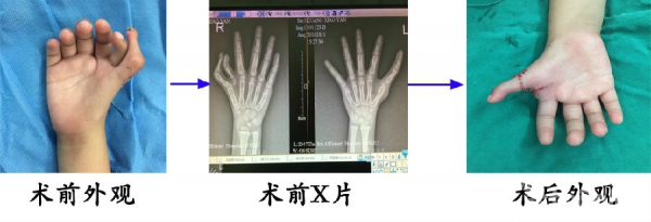 11.2岁,女,右手拇指复杂多指畸形,合并指骨骨骺肥大(桡侧主干指掌指关节通过肥大骨骺融合,主干指指尖出现鸡爪样返祖现象,外形较差,尺侧多余指,掌骨发育不良,但外形良好。行“换头术”(On-top plasty),术后2个月复查,拇指屈伸、对掌、抓握、对捏及外形恢复满意。