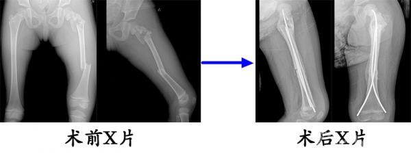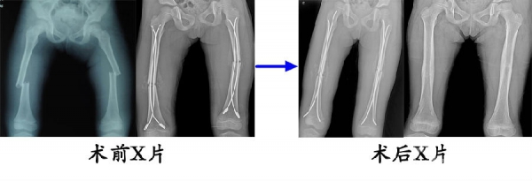 12.6岁,女,双侧股骨干骨折,在外院初次手术(髓内针直径过小,尾帽使用不当)复位不成功,来我院翻修(调整弹性髓内针直径,去除尾帽),翻修术后8个月,骨愈合良好,拆除弹性髓内针。