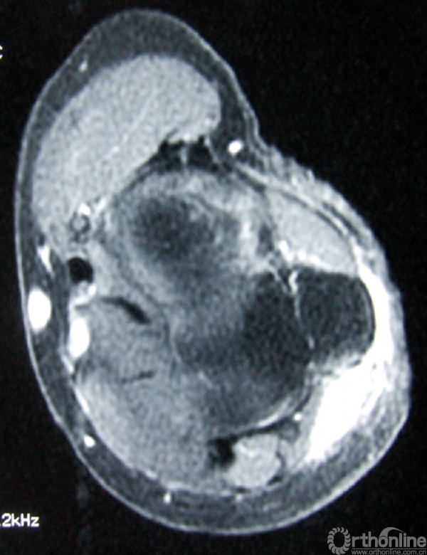 2.体格检查:右肘关节后侧可见两处手术疤痕(图1),各长约6cm、4cm,偏尺侧可触及直径约2cm肿物,质硬,边界不清,无活动度,可及压痛,局部皮肤颜色及皮肤温度未见异常,右肘关节活动无受限,右前臂及手感觉、肌力未见异常,右桡、尺动脉搏动可触及,右腋窝及肘窝淋巴结未触及肿大。