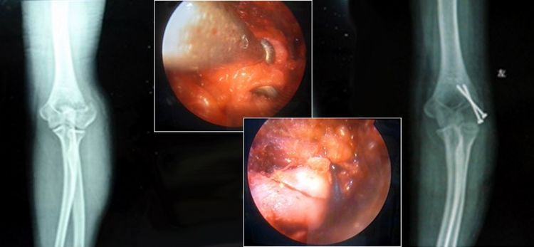 肘关节镜可以对桡骨头劈裂骨折等进行复位内固定,骨折愈合后也可以在关节镜下将内固定螺钉取出。