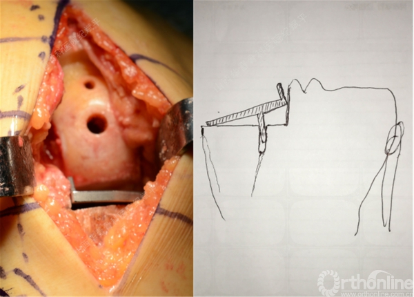 内外翻控制:最外侧一个钉孔对准胫骨内侧髁间隆起防止截骨面外翻(有基础研究证明,外翻的术后疼痛发生率较高);
