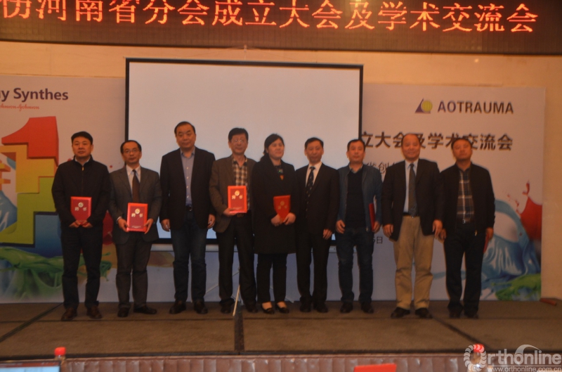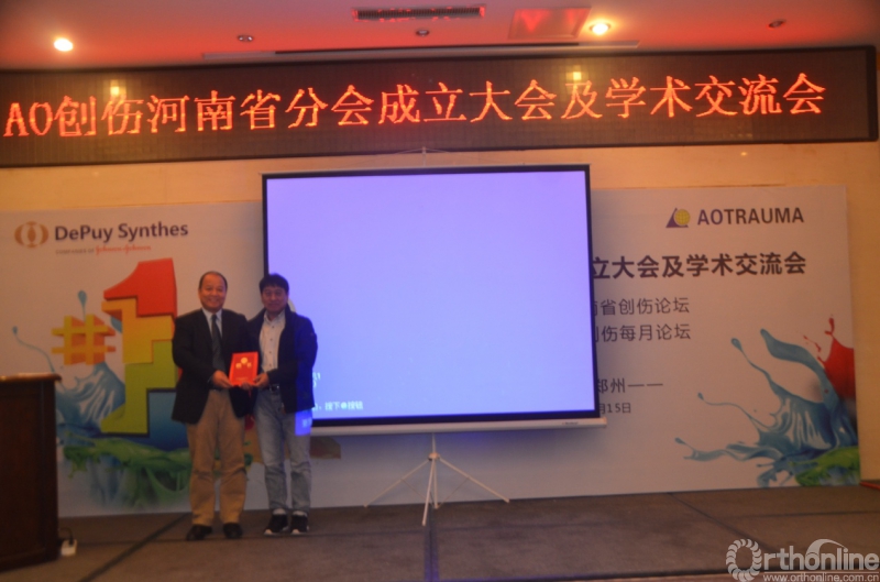 AO华北区主席马信龙向新任AO创伤河南省分会主席颁发证书