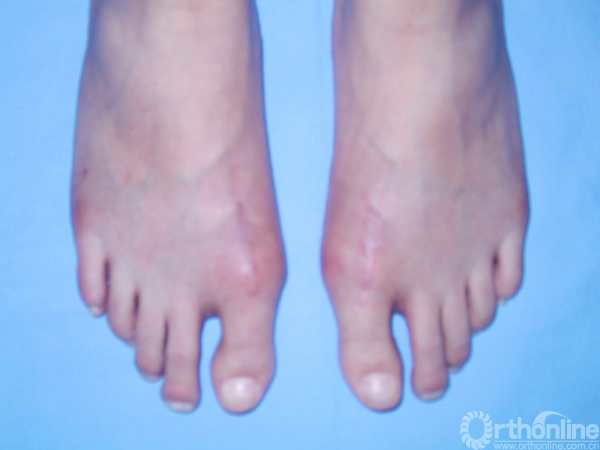 (三)并发症的处理:合并跖骨头处疼痛、胼胝体者不作特殊处理,随着拇外翻的纠正,大都能消除;合并垂状趾者行伸趾肌腱切断关节囊切开、屈趾肌腱移位、跖骨头颈部截骨等处理;合并小趾滑囊炎者行小趾骨赘切除或小趾跖骨颈截骨术处理;合并跖间神经瘤者行神经松解或神经瘤切除。