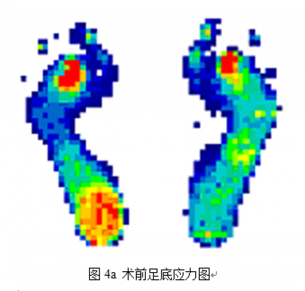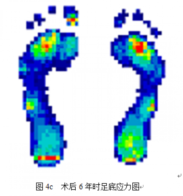 足底应力手术前后的变化:本组患者有36足术前、术后、术后3~7年后在T-SCAN足底应力测试仪上进行了足底应力静态测试。结果发现拇外翻患者术前前足负重点不在第1跖骨头处而发生内移,集中在第2、3跖骨头,从而使足底对应部位出现胼胝体。手术后前足足底第1~5跖骨头处应力值分布较术前均有明显变化,术后第1跖骨头下负重增加,2、3跖骨头处应力明显减少,1~5跖骨头下负重应力值趋于均匀,第2、3跖骨头下的胼胝体均明显减轻。3~7年后患者足底应力值第2、3跖骨头处有所增加,但较术前明显减少(图4)。大部分患者未再出现胼胝体,部分患者再次出现胼胝体,但也较术前明显减轻。