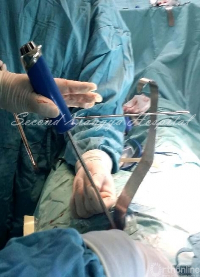 5.另一拉钩置于椎体侧前、交感神经链前方,将其稍向后牵开;