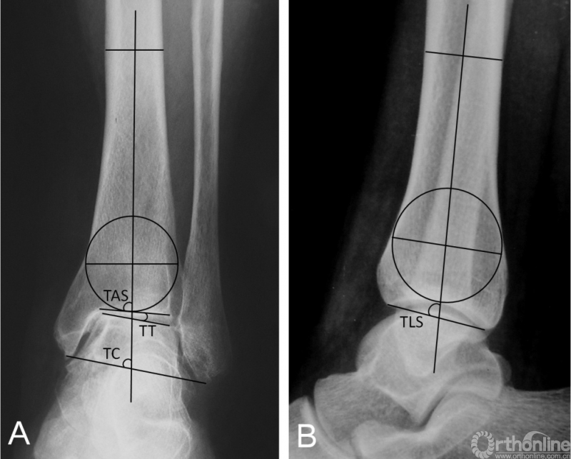 图1 踝关节前后位X线片(1A):TAS,胫骨前侧关节面角;TT,距骨倾斜角;TC,胫骨踝穴角。踝关节侧位X线片(1B):TLS胫骨侧位关节面角。