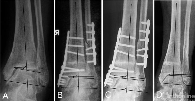 手术采用硬腰联合麻醉或全身麻醉,患者取仰卧位。单纯胫骨截骨的患者,取踝关节前内侧切口,显露踝关节前内侧间隙和胫骨远端前内侧骨面,用骨刀或摆锯清理踝关节前侧和内侧骨赘;截骨线位于内踝尖上4~5cm,通过克氏针术中定位后,用摆锯由内向外平行于胫骨远端关节面,或由内上向外下稍倾斜截断内侧、前侧及后侧皮质,保留外侧皮质;如果术中胫骨远端外侧骨皮质断裂且发生移位,则需固定截骨部位前外侧(也可保护性使用)。撑开截骨间隙,通过自体骨、同种异体骨或人工骨填充截骨间隙;术中透视确定和调整至矫形满意后行内固定。如果术前或术中判断需要行腓骨截骨(见讨论部分),辅助外侧切口,在下胫腓水平或以上,行腓骨斜形截骨,增加外翻角度或适当短缩。如果合并腓骨截骨,首先固定腓骨,再判断胫骨的矫正程度并固定。