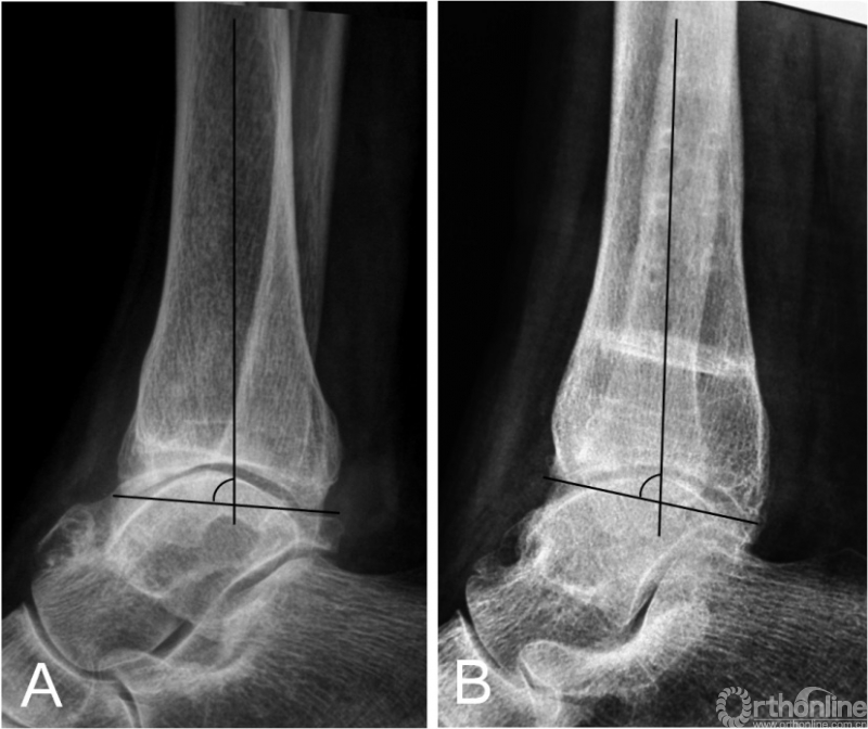 图4 术前踝关节侧位X线片提示踝前骨赘形成,胫骨侧位关节面角为85°(4A);行关节清理及踝上截骨术后X线提示胫骨侧位关节面角为81°(4B)。