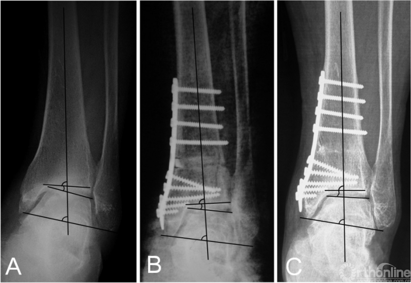 图5术前的距骨倾斜角(TT)为10.7°(5A),术后矫正至7.8°(5B);然而术后32个月随访时TT则已经恢复至1.5°(5C)。