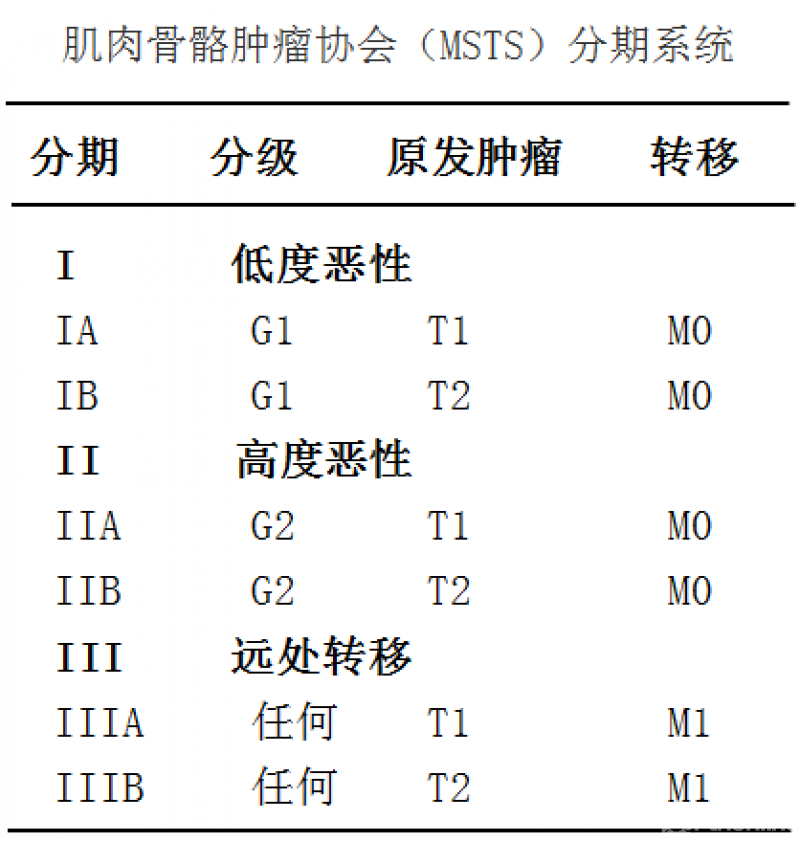 定义:G1,低级别肿瘤;G2,高级别肿瘤;T1,肿瘤位于间室内(局限于骨);T2肿瘤位于间室外;M0,无转移;M1,任何转移。