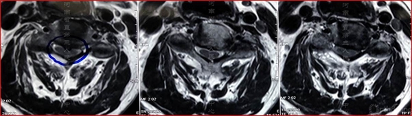 术前MRI(C3-4-5椎间盘轻度突出,黄韧带肥厚,双阶段椎管狭窄)
