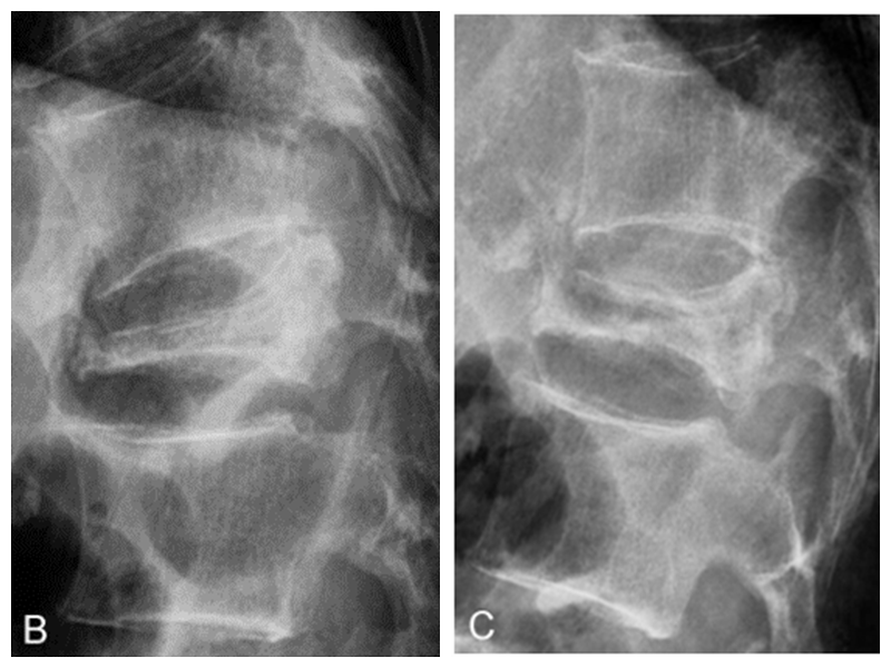 ②在Xray片上表现为:上终板下方线形或半月形的透亮阴影;仰卧位时最明显,在站立位时不明显或消失。(B为站立位,C为仰卧位);