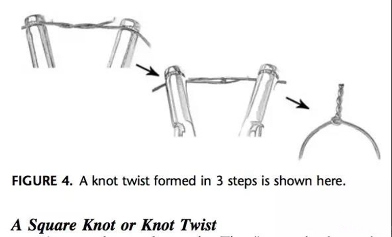 先用钢丝打一个普通方结的第一结,然后均匀扭转钢丝形成对称扭结。