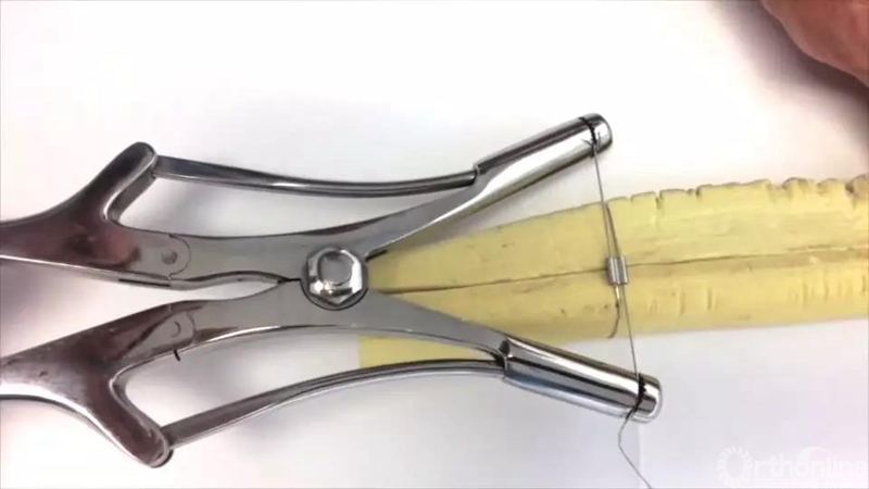 最常用、最基本的钢丝捆扎法。绕过骨头一圈或两圈捆扎,距离骨面约2-3cm处钳夹钢丝,轻轻提拉并一个方向(一般是顺时针)匀速扭动,注意每次扭转时发力要匀称。钢丝顺势对称扭转,扭结贴紧骨面即加压扎紧。留1.5cm左右、至少三个扭结处剪断,残端折弯贴合骨面。