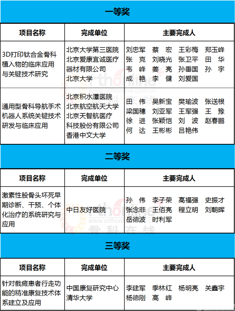 此次北京科技奖共颁发一等奖24项,二等奖58项,三等奖130项,涉及646家科研单位和1648名科研人员。其中,骨科获奖项目如下: