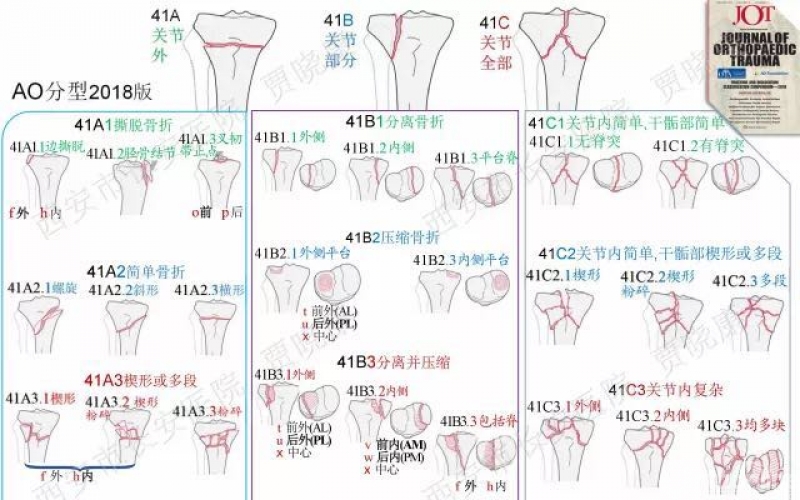 1990年国际内固定研究会(AO/ASIF)有关长骨骨折的综合分类,将胫骨平台骨折归为胫骨近端骨折,其中部分关节内骨折为B型(其特征有部分关节面仍与干骺端-骨干部相连),若关节内骨折且与骨干部分离则归为C型,故共分为两型6组18个亚型。1996年美国创伤骨科学会(OTA)有关骨折和脱位的分类(OTA分类)认同了AO骨折分类。