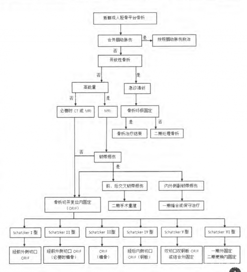 SchatzkerV型骨折若存在并发症和严重软组织损伤,应首先处理血管、神经损伤,使用外固定支架固定,待条件允许时行二期切开复位内固定。