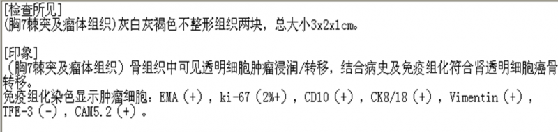 ②2012年骨扫描及PET-CT提示第7胸椎及右侧第7肋骨代谢增强,考虑肿瘤骨转移,并行靶向治疗口服多吉美,同时配合局部放疗(过程中有因药物反应停药)。