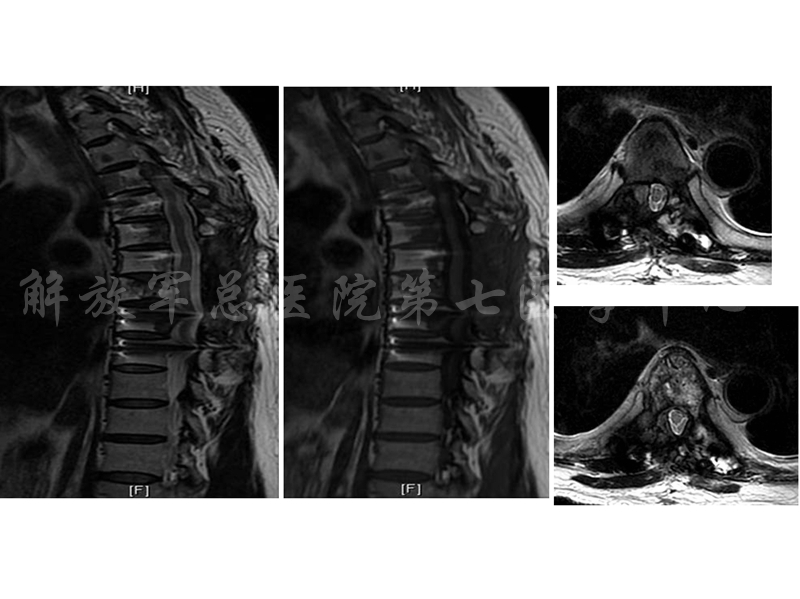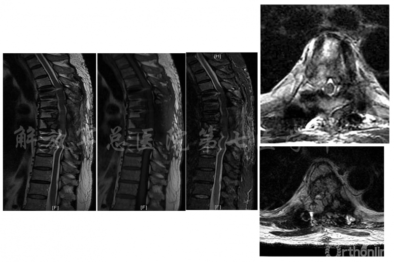 平车入病房,胸背部中上段局部有叩压痛,痛无明显放散,剑突以下皮肤感觉减退,腹壁反射及提睾反射未引出,双下肢肌张力高,双侧髂腰肌减弱达1级、双侧股四头肌4级、双胫后肌、腓骨长短肌及小腿三头肌肌力达0-1级,左足伸拇肌力达3级、双侧膝腱、跟腱反射活跃,双侧巴彬斯基征(+),踝阵挛(+)。