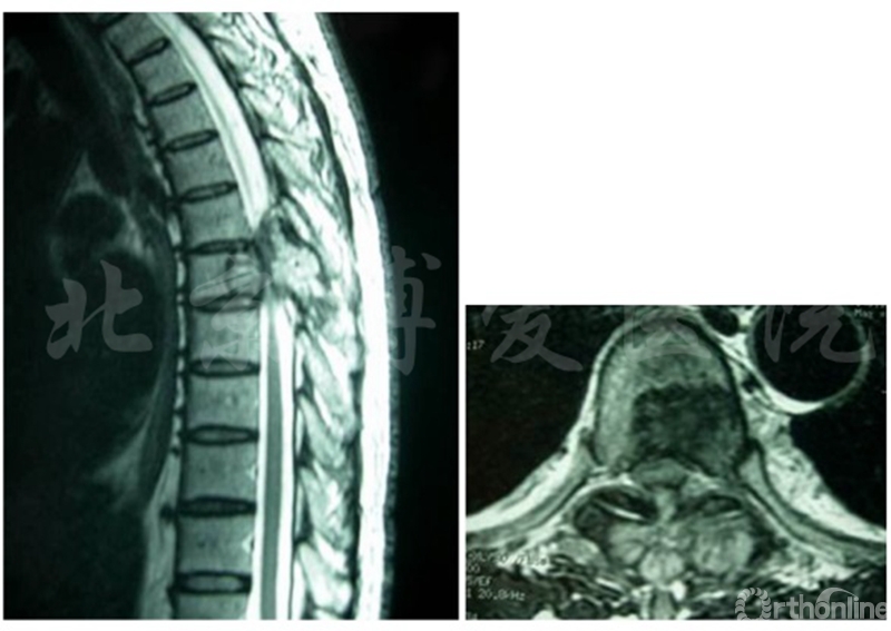 2015.9出现后背部及双肋部疼痛,再次复查胸椎是CT示病变范围较前加重,后期口服药物及射波刀治疗疼痛有所缓解,但出现双下肢麻木无力。