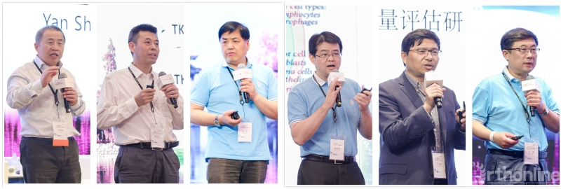 在该主题最后的学术讨论中,严世贵教授、柴伟教授、唐杞衡教授、赵建宁教授、朱庆生教授和河南省人民医院郑稼教授,一同对膝关节翻修术中的暴露、假体取出、关节线确定等重要步骤进行了探讨与分享。