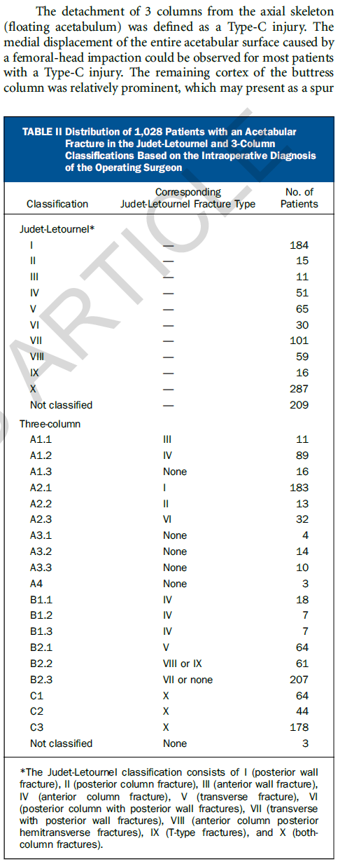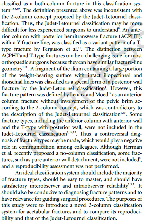 Letournel-Judet分型基于双柱理念将髋臼骨折分为5型简单、5型复杂骨折,已成为髋臼骨折诊断中最为常用的分型系统。然而,该分型存在包括不全、难以理解、容易混淆等弊端,充分掌握该分型需要较长的学习曲线;且其并未对各类型骨折的治疗提供指导,故其临床应用存在一定的局限性。
