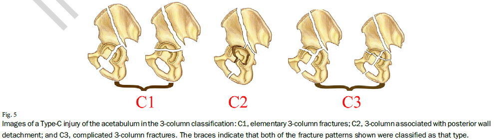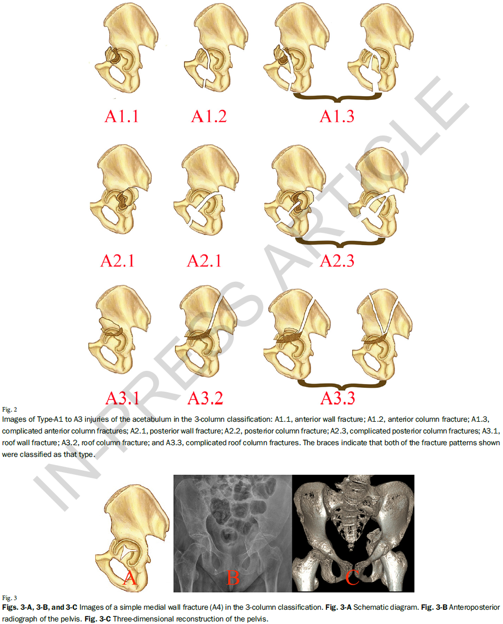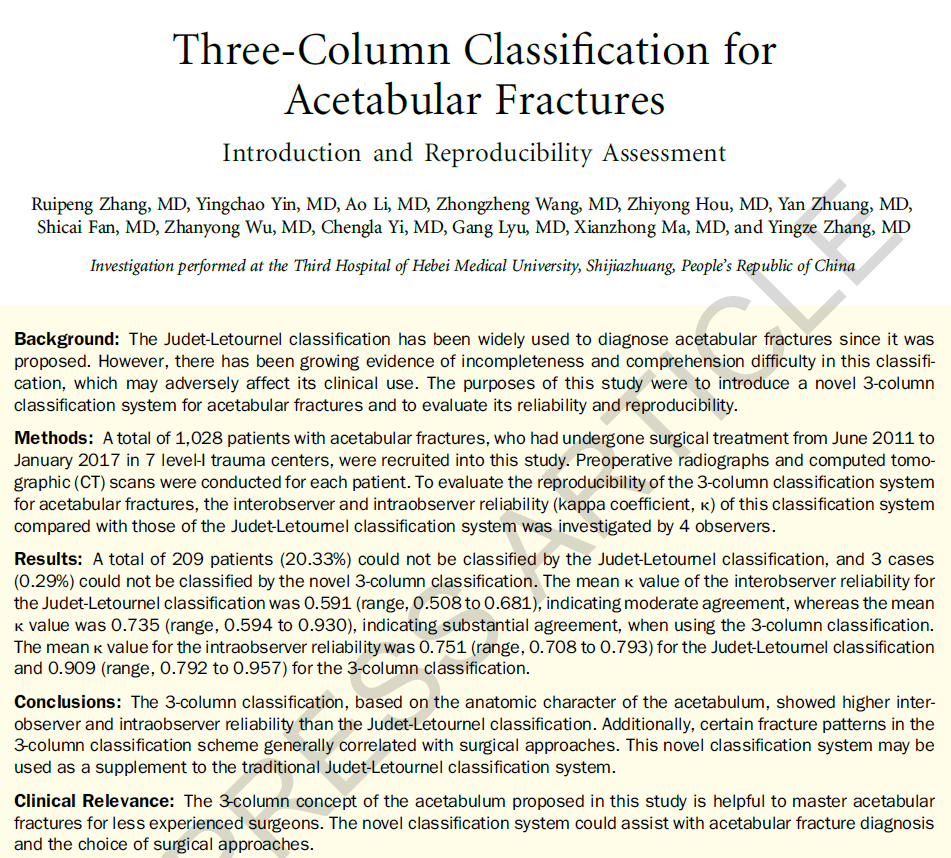 河北医科大学第三医院张英泽院士、侯志勇教授团队基于髋臼的解剖结构提出了髋臼骨折的三柱分型,将髋臼骨折分为单柱骨折、两柱骨折、三柱骨折三大类。该分型囊括骨折类型多、分型规律性强,解决了Letournel-Judet分型中的诸多问题,便于初学者掌握。
