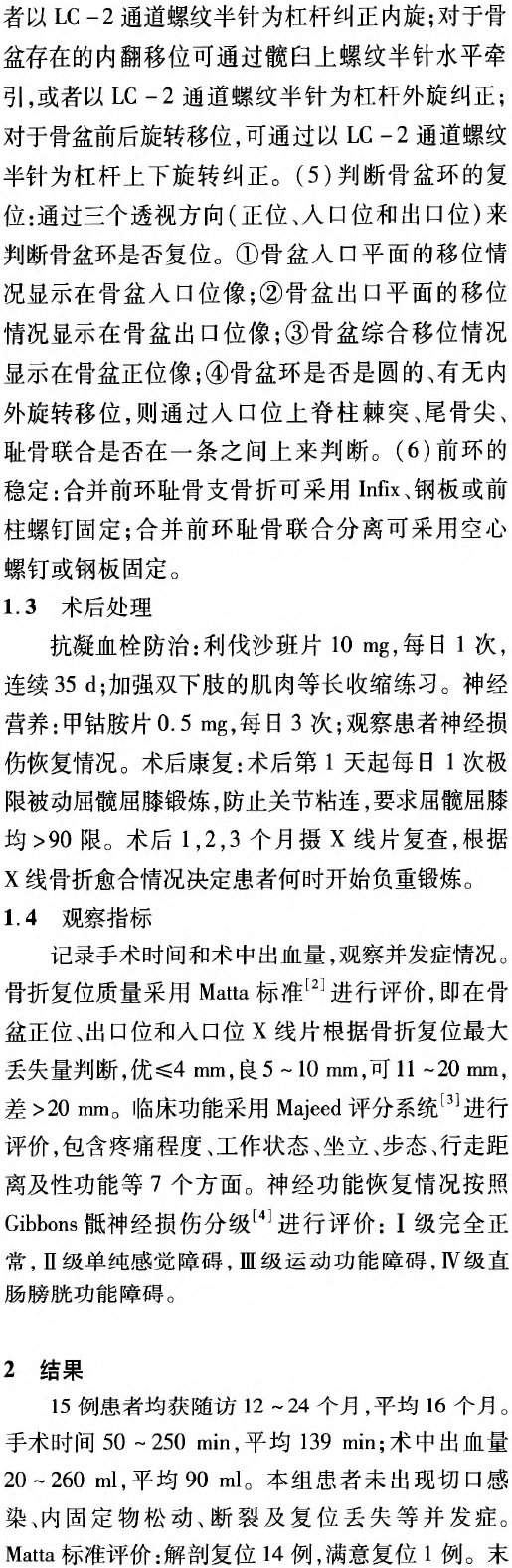 根据Matta标准对骨折复位质量进行评价,根据Majeed功能评分系统及Gibbons骶神经损伤分级分别对临床功能和神经功能进行评价。结果15例患者均获随访12—24个月,平均16个月。手术时间50-250min,平均139min。术中出血量20-260 ml,平均90ml。患者均未出现切口感染、内固定物松动、断裂及复位丢失等并发症。