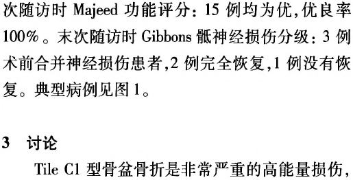 Matta标准评价:解剖复位14例,满意复位1例。末次随访时Majeed功能评分:15例均为优,优良率100%。末次随访时Gibbons骶神经损伤分级:3例术前合并神经损伤患者,2例完全恢复,1例没有恢复。结论骨盆外架复位系统联合通道螺钉固定治疗Tile CI型骨盆骨折,骨折复位满意,通道螺钉固定可靠,功能恢复满意。