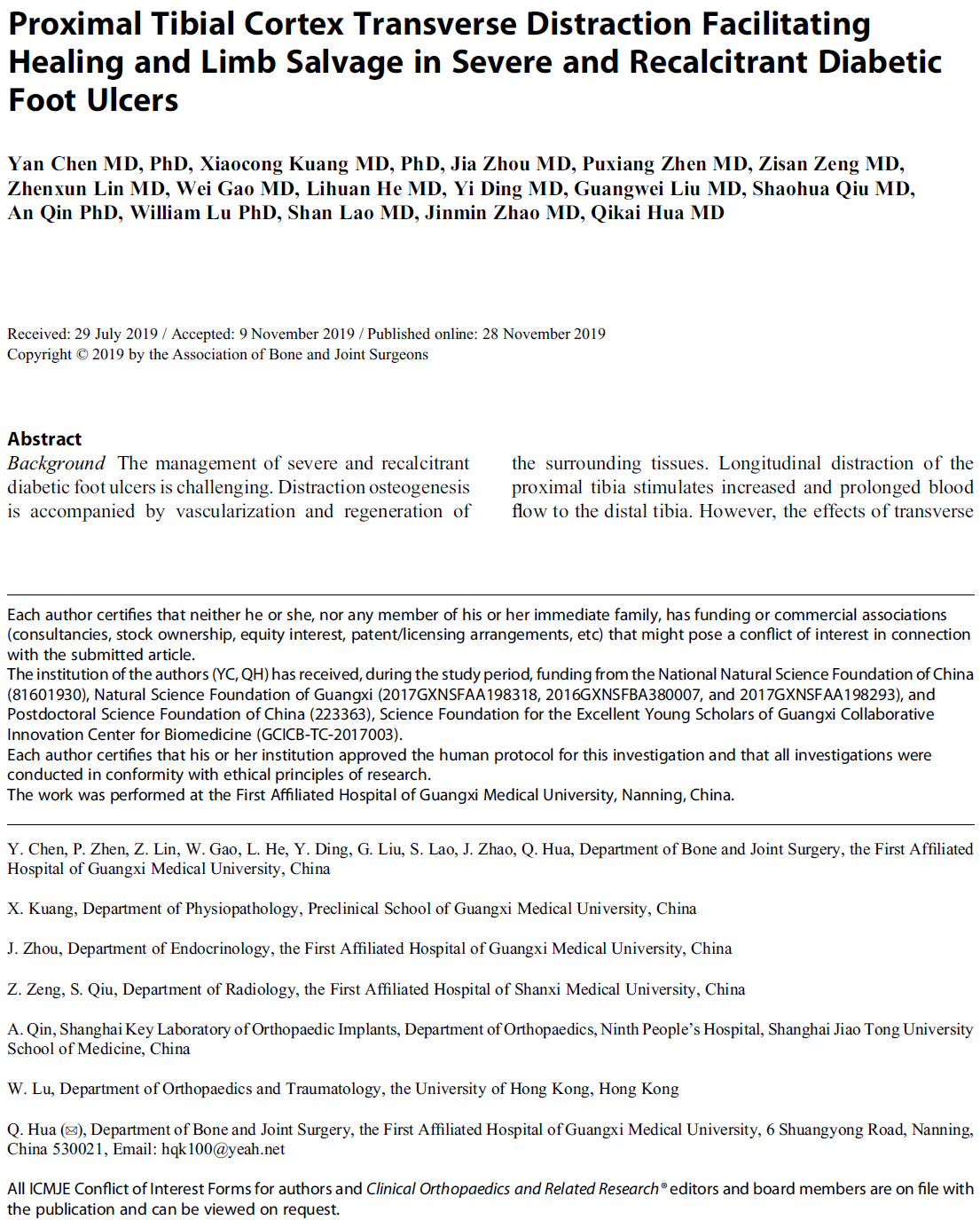 2020年4月1日,广西医科大学第一附属医院骨科赵劲民、花奇凯教授团队在骨科顶级期刊《Clinical Orthopaedics and Related Research》(IF=4.154)发表了题为“Proximal Tibial Cortex Transverse Distraction Facilitating Healing and Limb Salvage in Severe and Recalcitrant Diabetic Foot Ulcers”原创性临床研究成果,并同期发表评论文章。
