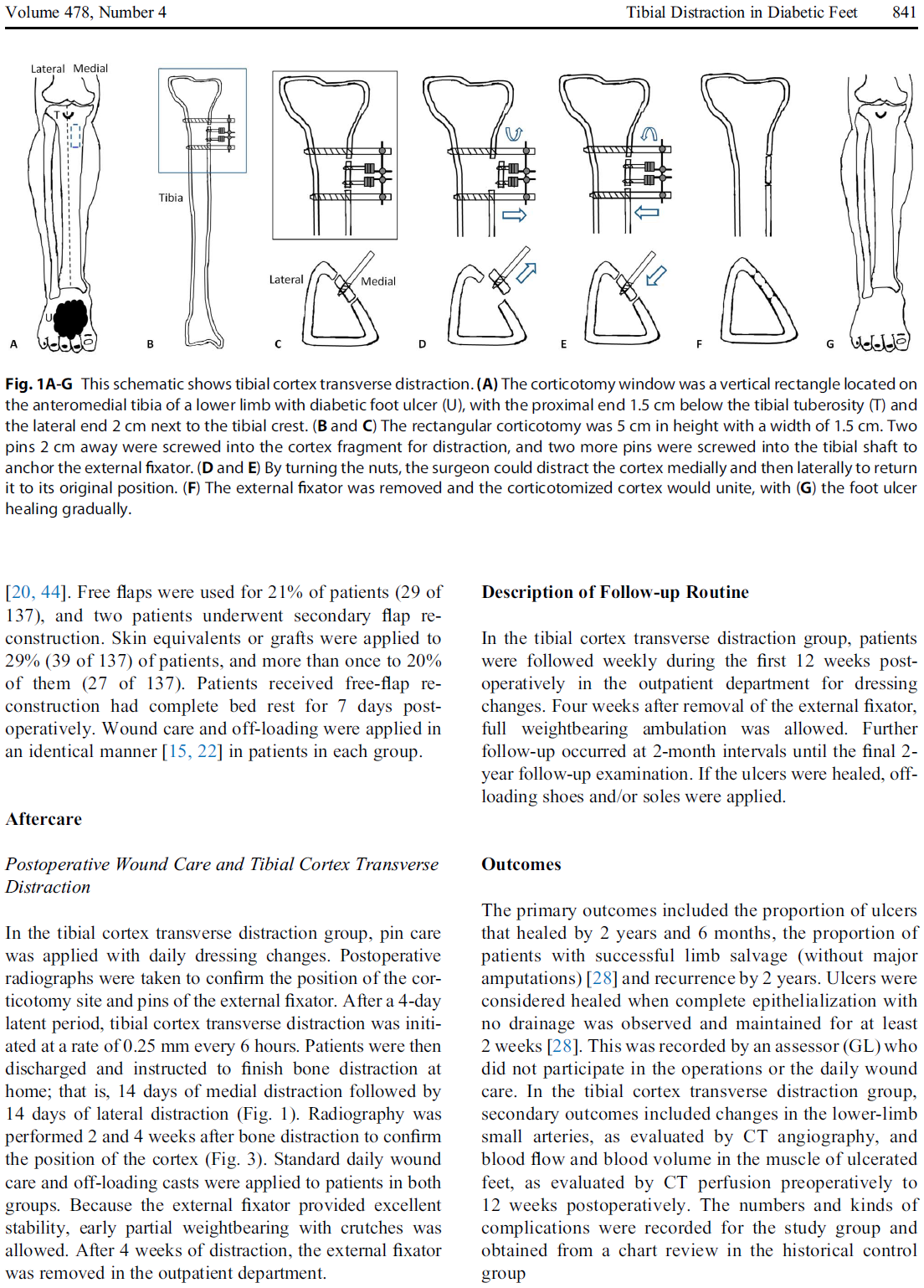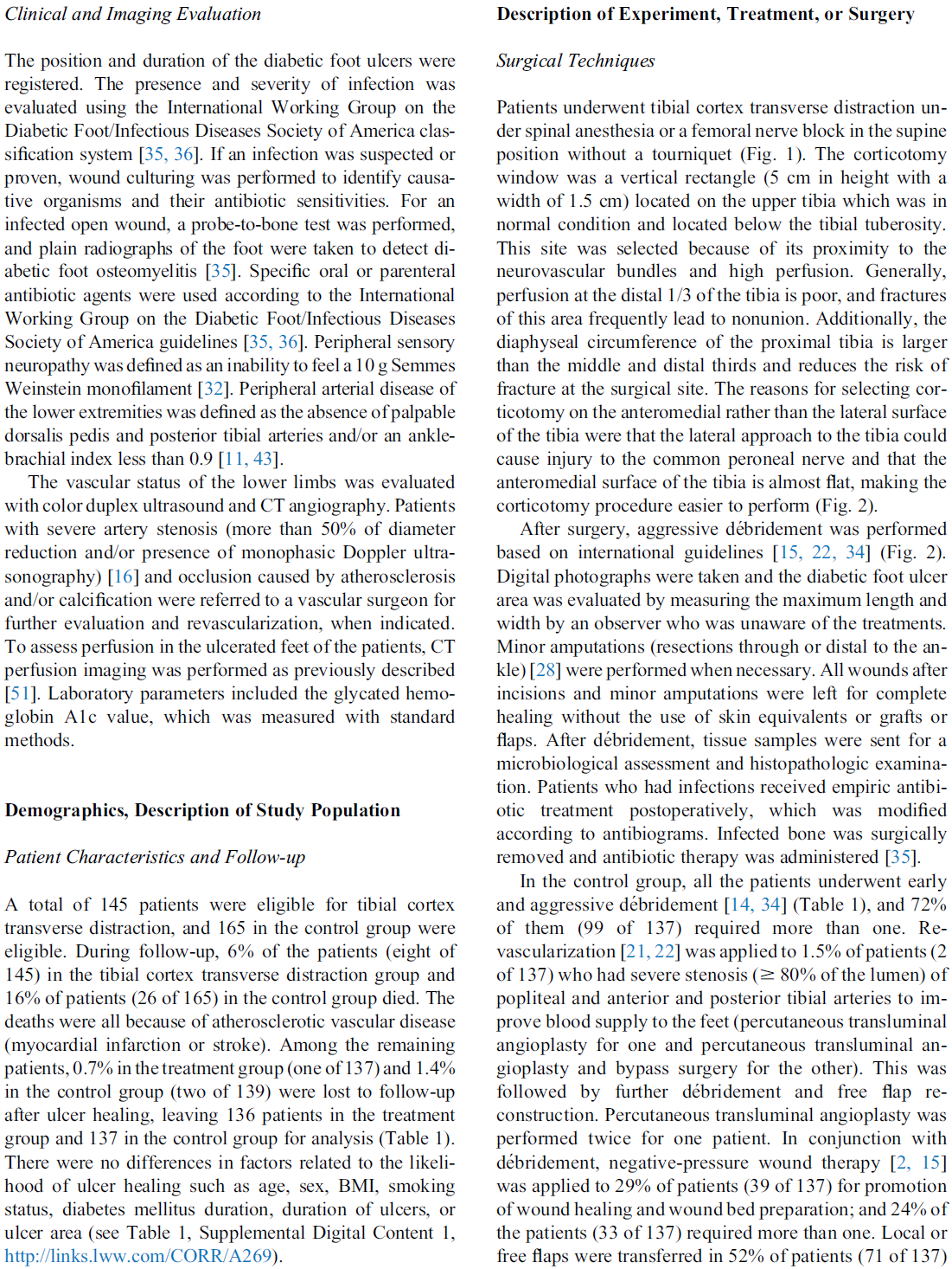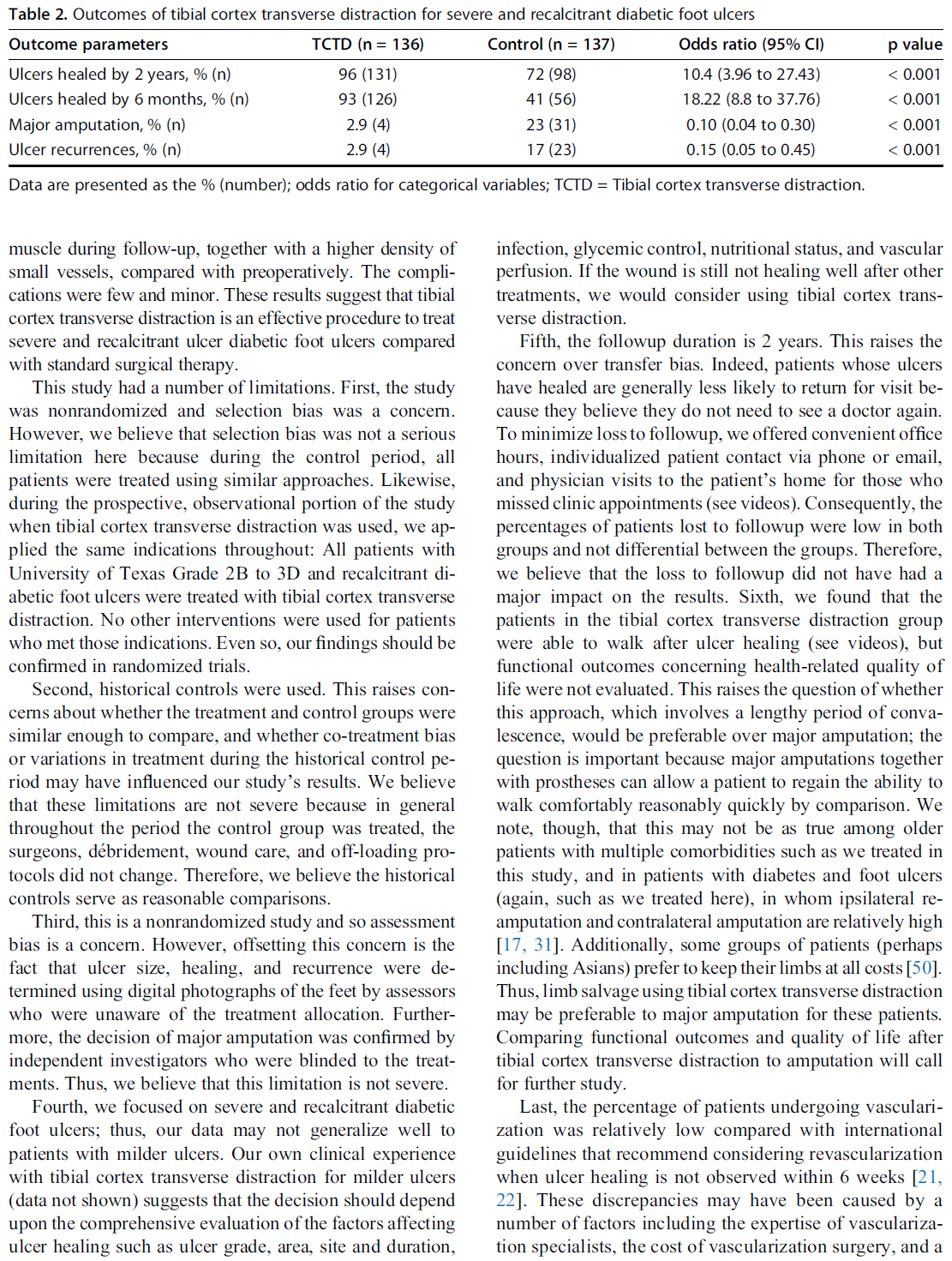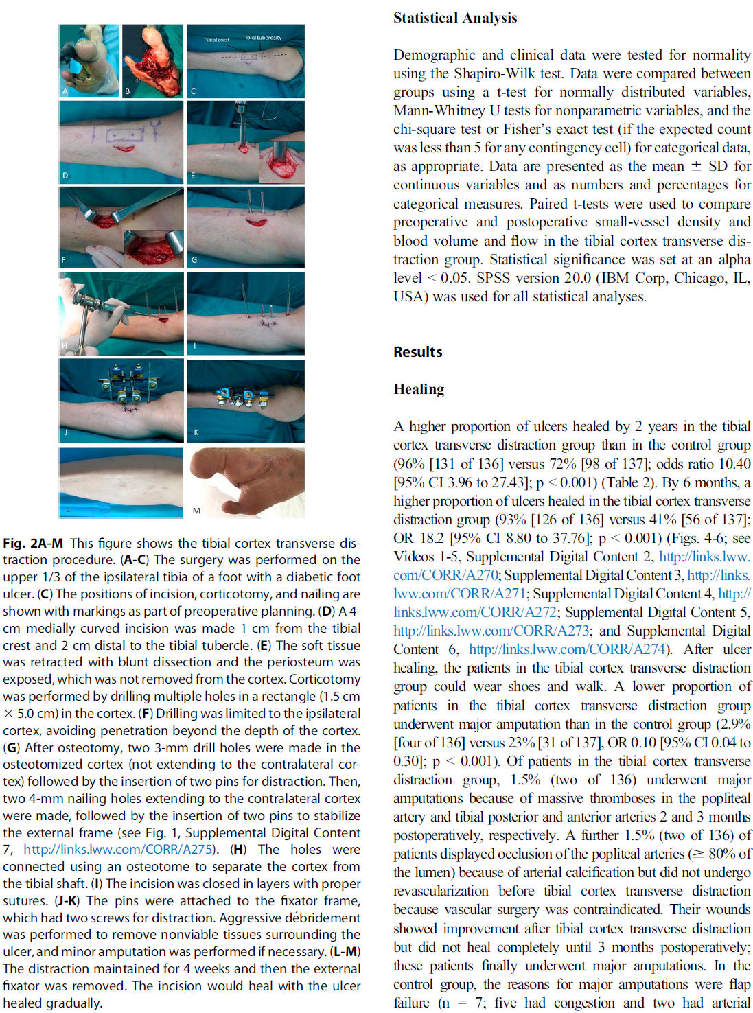 在此项临床研究中,该团队于2014年7月至2017年3月间,对136例Texas分级2B至3D的患者(溃疡平均面积为44cm2±10cm2)进行胫骨横向骨搬移手术,术后患者仅接受常规换药处理及标准护理措施,并将这些患者与在2011年5月至2013年6月之间采用标准外科手术治疗的137例重度糖尿病足患者进行了比较,这些患者接受了清创,血运重建,局部或游离皮瓣或移植重建手术以及负压伤口等治疗手段。