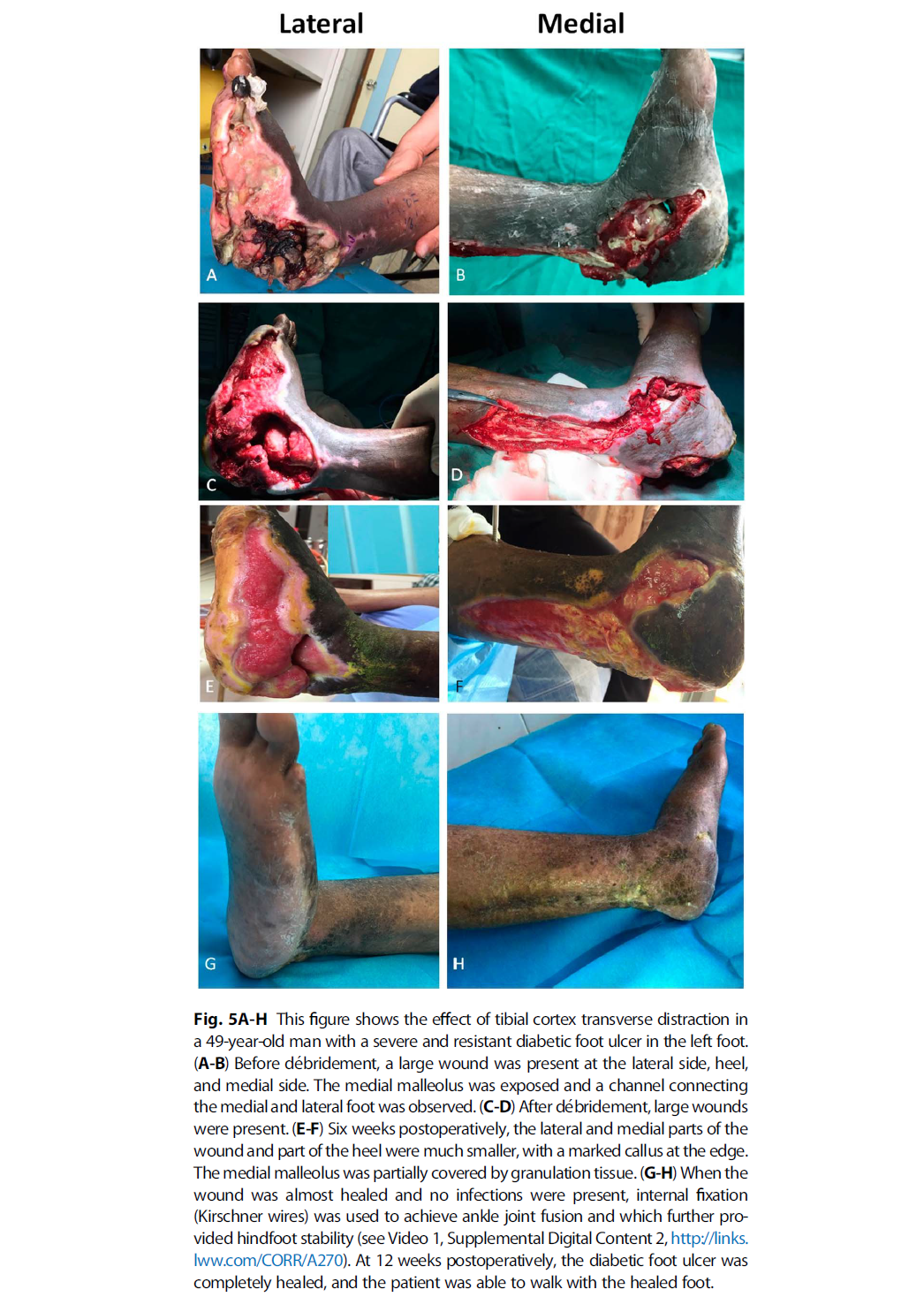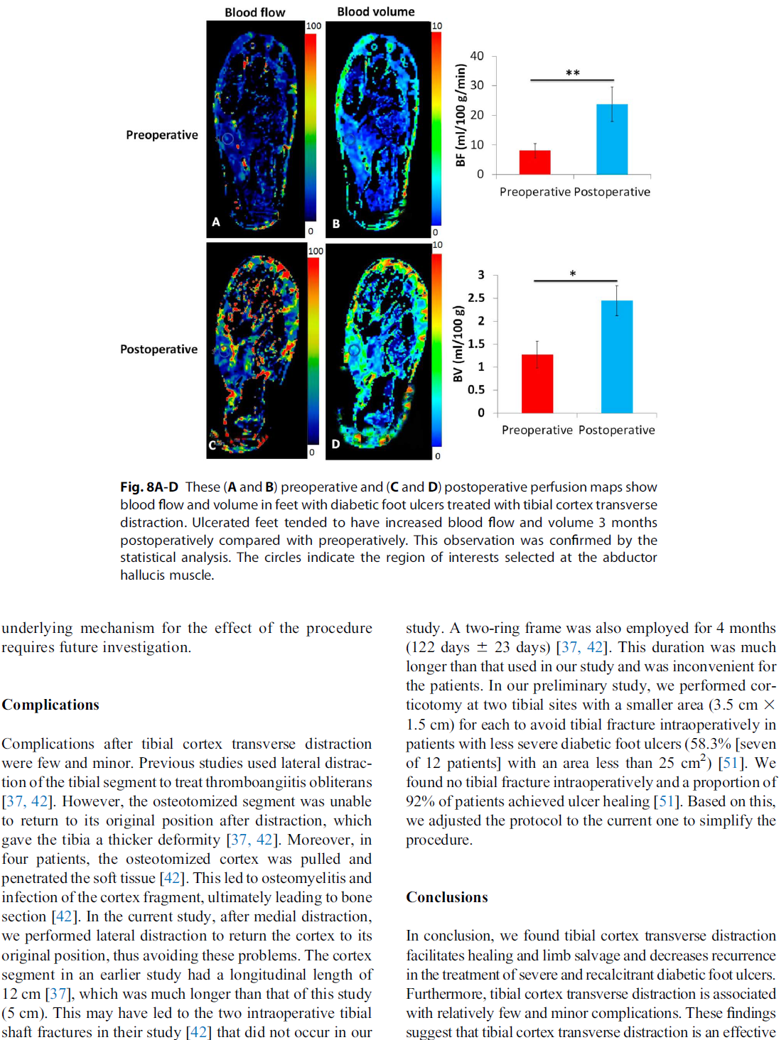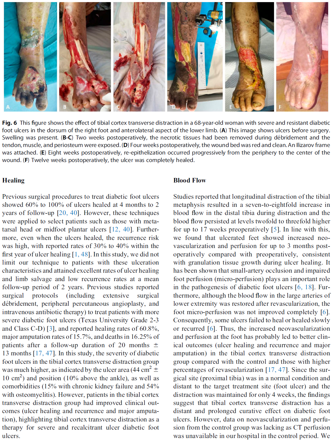 在此项临床研究中,该团队于2014年7月至2017年3月间,对136例Texas分级2B至3D的患者(溃疡平均面积为44cm2±10cm2)进行胫骨横向骨搬移手术,术后患者仅接受常规换药处理及标准护理措施,并将这些患者与在2011年5月至2013年6月之间采用标准外科手术治疗的137例重度糖尿病足患者进行了比较,这些患者接受了清创,血运重建,局部或游离皮瓣或移植重建手术以及负压伤口等治疗手段。