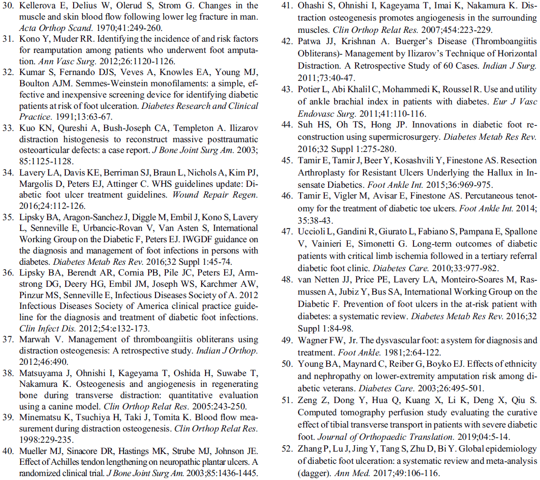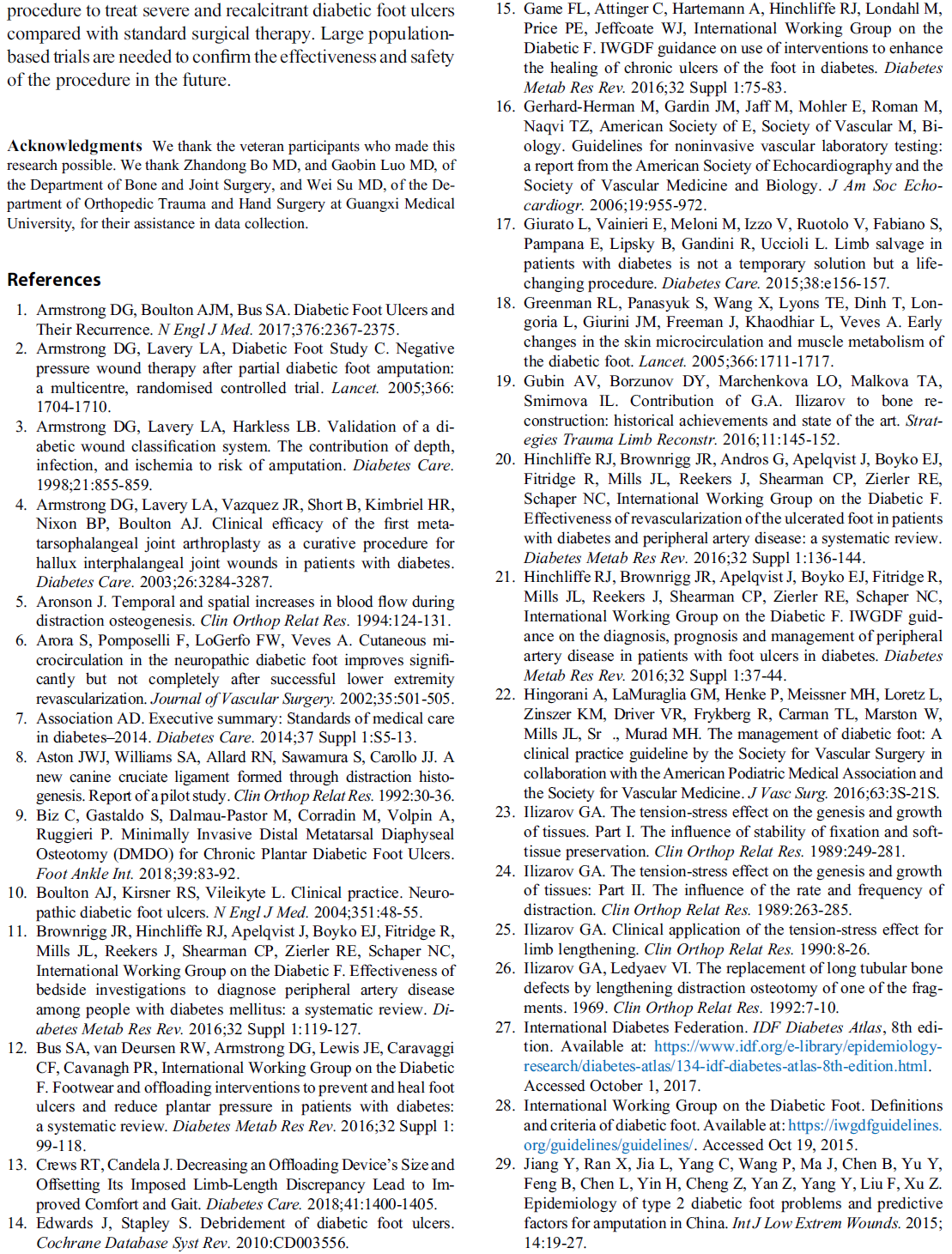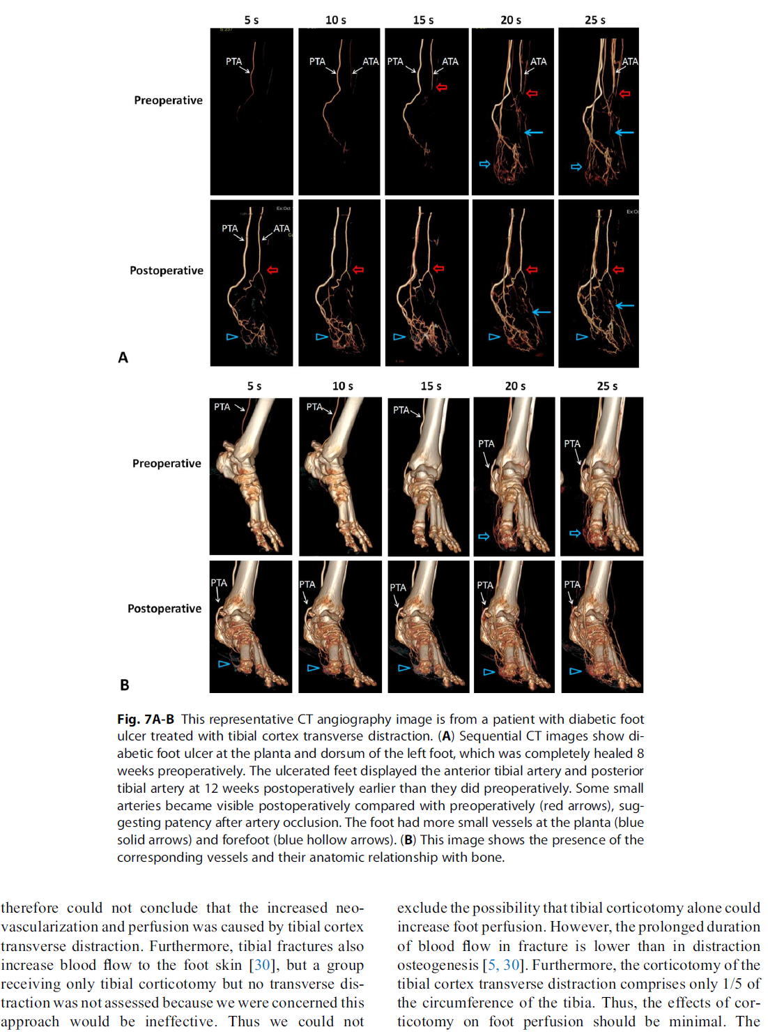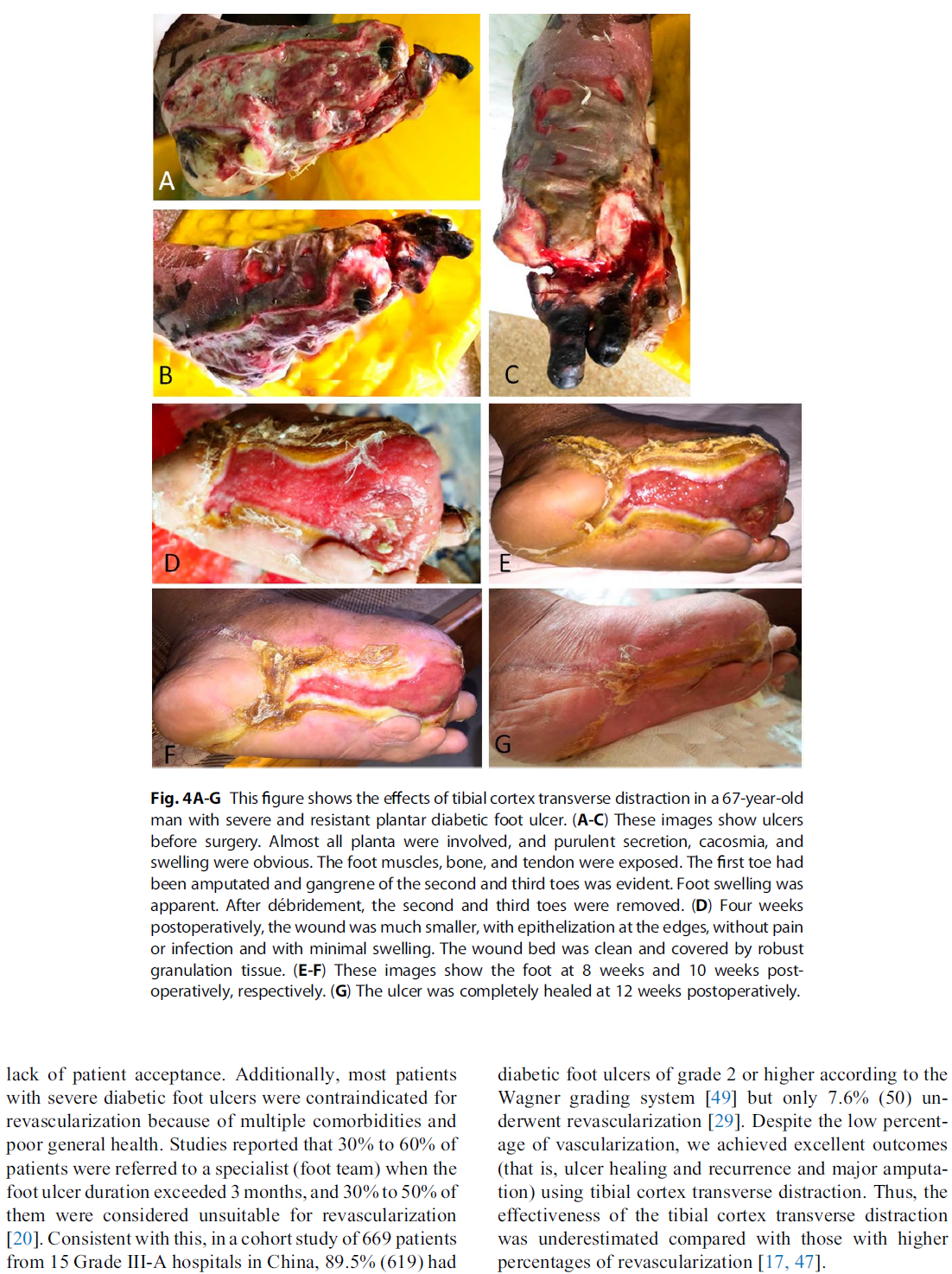 在此项临床研究中,该团队于2014年7月至2017年3月间,对136例Texas分级2B至3D的患者(溃疡平均面积为44cm2±10cm2)进行胫骨横向骨搬移手术,术后患者仅接受常规换药处理及标准护理措施,并将这些患者与在2011年5月至2013年6月之间采用标准外科手术治疗的137例重度糖尿病足患者进行了比较,这些患者接受了清创,血运重建,局部或游离皮瓣或移植重建手术以及负压伤口等治疗手段。