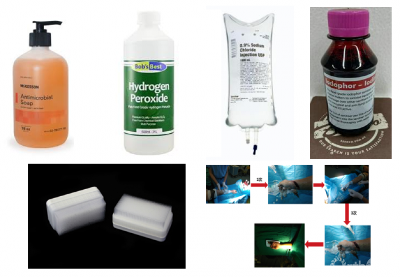 清洗:经彻底清创后,用1‰的新洁尔灭溶液浸泡伤口3~5分钟,以无菌生理盐水冲洗伤口2~3次。更换手术器械及手套,伤口周围重新消毒再铺一层无菌巾。